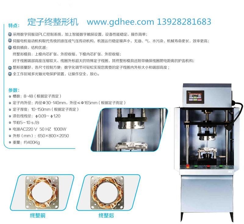 華源電機設備有限公司定子終整型機采用數字伺服及PLC控制系統智能控制,模具采用“上模內芯擴張、下模內芯擴張、外腔收縮”來按照工藝要求對內外線圈的定子完美整型,使定子更加耐久,符合安全要求和美觀而設計。可對0.10-----1.20mm嵌好的漆包線定子按工藝要求對內外線圈進行完美整型,輕易安裝轉子和端蓋。操作簡單,性能穩定,效率高;其優勢在于: